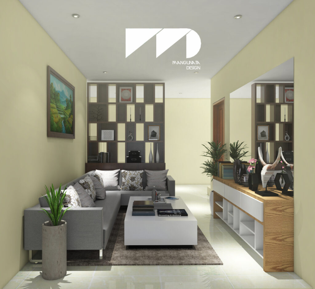 A sleek and comfortable living room with a modern minimalist touch. Featuring functional shelving, balanced lighting, and custom furniture to enhance both aesthetics and space efficiency.